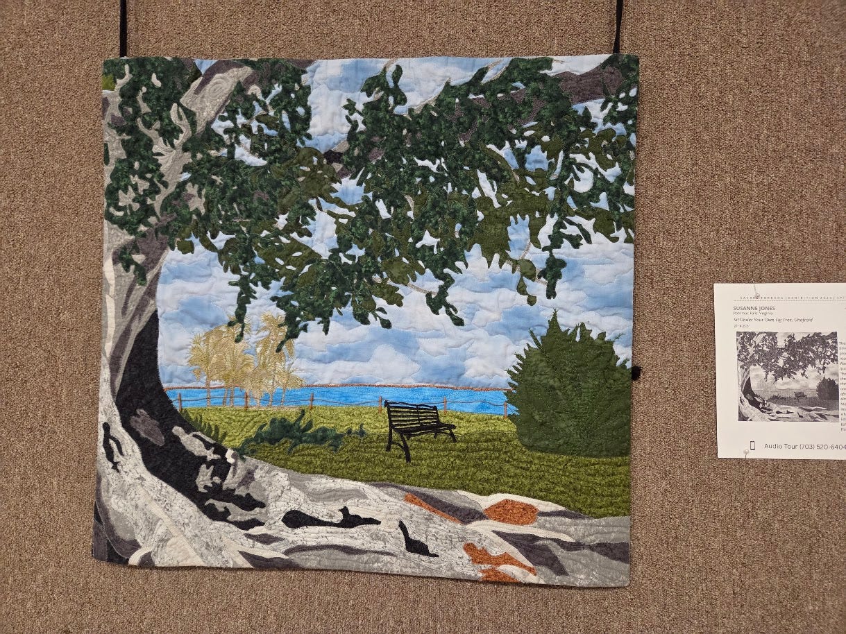 About the photos: These are two of the art quilts from the weekend’s traveling show. I hate that I didn’t get the artist’s name for the first one. The quilt celebrates her slow recovery from back surgery, moving from dark-colored “log cabin” squares to the triumphant image in the center. The other quilt by Susanne Jones of Virginia is titled “Sit Under Your Own Fig Tree, Unafraid.” It looks three-dimensional, but it’s all flat, quilted fabric.